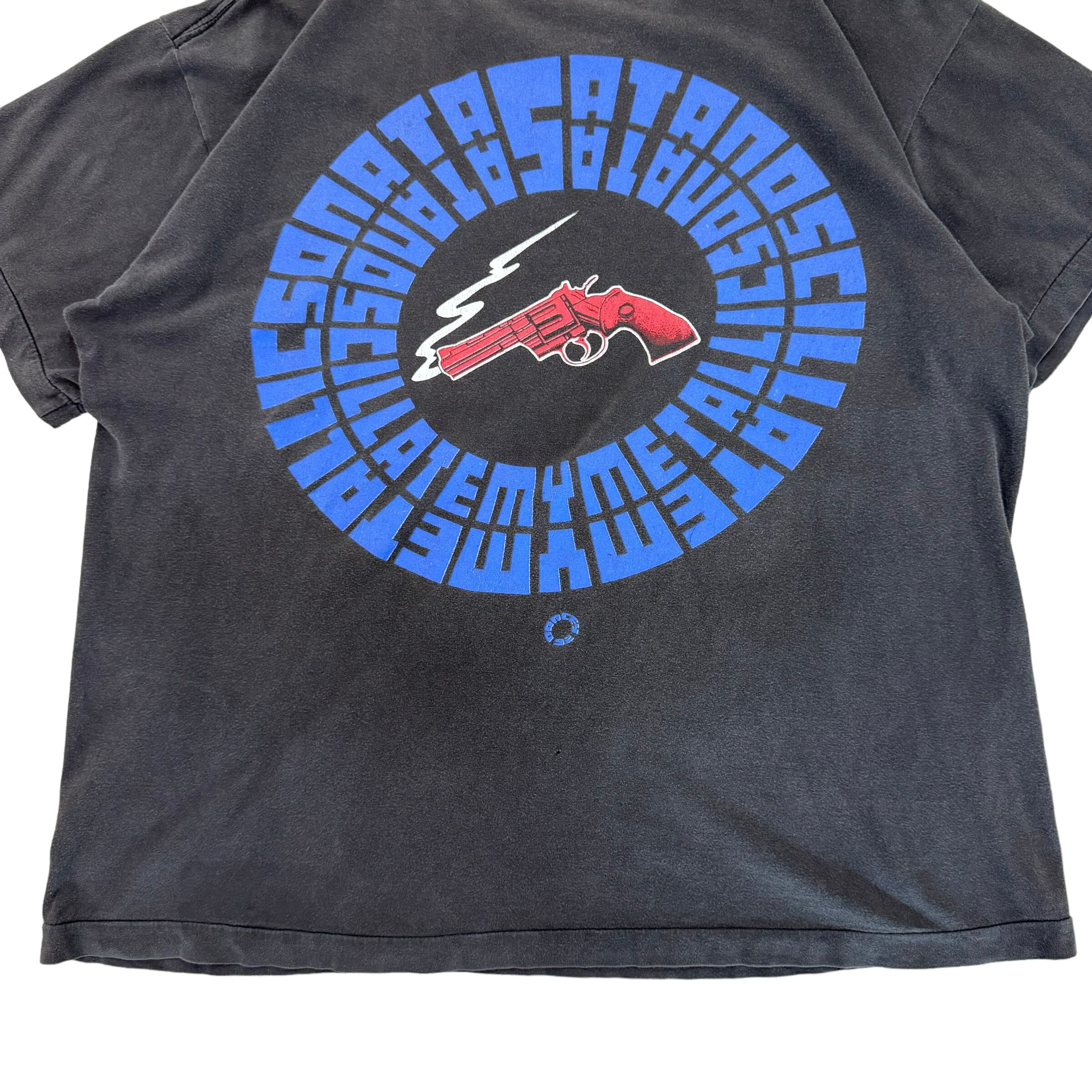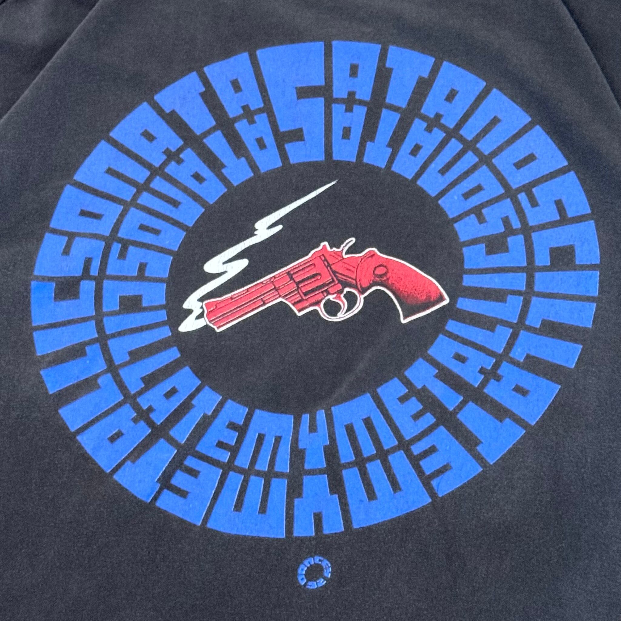 バックはSOMMS (Satan oscillate my metallic sonatas)の回文と、銃、フロントはバッドモーターフィンガーのグラフィックデザインがプリントされております。